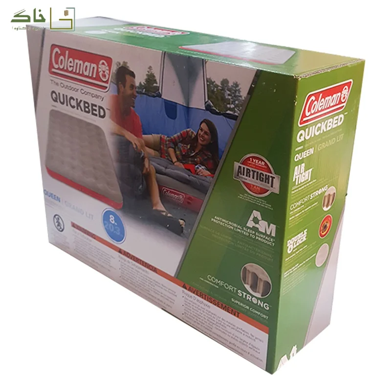 تشک بادی دو نفره کلمن مدل QuickBed Queen دارای یک طراحی منحصر به فرد و مختص به شرکت کلمن است. در طراحی تشک بادی دو نفره کلمن از یک ساختار فنر مانند محکم (Coil Construction) استفاده شده است به گونه ای که بیشترین راحتی را به هنگام خواب و استراحت برای شخص فراهم می نماید. تشک بادی QuickBed Queen مناسب دو نفر می باشد و می تواند وزنی تا 272 کیلوگرم را تحمل نماید. رویه تشک بادی دو نفره کلمن از جنس پارچه مخملی (Soft Plush Top) است که نرمی و لطافت خاصی به تشک بخشیده است. همچنین بدنه این تشک بادی از جنس PVC (پلی وینیل کلراید) می باشد که مقاومت بالایی در برابر نور خورشید دارد وعایق خوبی در برابر آب محسوب می شود. ضخامت تشک بادی دو نفره کلمن 20.3 سانتی متر می باشد که مانع عبور رطوبت و سرما از زمین به بدن افراد می شود تا لذت یک خواب راحت و آرام را تجربه کنند. در سطح تشک بادی کلمن فرو رفتگی های متعددی وجود دارد که باعث می شود تا فشار کمتری به ماهیچه های بدن افراد در زمان استراحت وارد شود تا بتوانند با آرامش بیشتری به خواب روند. از ویژگی های جالب تشک بادی کلمن خاصیت ضد میکروبی (Antimicrobial) سطح آن است که باعث جلوگیری از ایجاد بوی نامطبوع و قارچ و کپک می شود. از دیگر ویژگی های QuickBed برخورداری از سیستم هوابند (AirTight) می باشد؛ به این معنی که تشک از لحاظ ضد نشت بودن (Leak-Free) در کارخانه مورد آزمایش قرار گرفته است و با وجود دریچه هوای دو قفله ای (Double Lock Valve) که دارد، مشکل هوا دادن و کم باد شدن احتمالی برطرف شده است. دریچه هوای دو حالته به گونه ای طراحی شده که در هنگام اتصال به پمپ باد، قسمت پستونکی کاملاً به بیرون کشیده می شود تا تشک به آسانی و در مدت زمان کمی باد شود؛ پس از باد شدن و برای جلوگیری از نشت باد به بیرون به هنگام خارج کردن نازل پمپ، ابتدا باید دریچه را به داخل فشار داد و پمپ باد را خارج نمود و سپس درپوش را بست. پس از استفاده و خالی کردن هوای داخل تشک، تشک بادی کلمن به آسانی جمع می شود و در حالت جمع شده فضای کمی را اشغال می کند و در نتیجه حمل آن بسیار آسان است. لازم به ذکر است که این تشک بادی شامل پمپ باد نمی باشد و پمپ باد باید به صورت جداگانه خریداری شود. در صورتی که قصد دارید از این تشک در هنگام کمپ استفاده کنید، پیشنهاد می شود از پمپ های باد باتری خور استفاده شود تا نیازی به باد کردن تشک در جایی غیر از محل خواب و سپس جا به جایی آن نباشد؛ زیرا پس از باد شدن حمل تشک به درون چادر ممکن است قدری مشکل باشد.