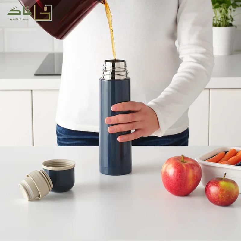 فلاسک استیل ایکیا مدل HALSA کد 40450637 حجم 0.5 لیتر محصولی از برند با کیفیت و معتبر «ایکیا» (IKEA) است. زمانی که در حرکت هستیم، گاهی به استراحت نیاز داریم. با فلاسک HALSA می توانید همیشه، در قطار، در ماشین یا در یک پیاده روی خوب خارج از منزل، قهوه، چای، آب جوش، شربت یا هر یک از نوشیدنی های سرد یا گرم مورد علاقه خود را در دسترس داشت. فلاسک استیل HALSA محتویات را برای مدت طولانی گرم/سرد نگه میدارد و لازم نیست هنگام ریختن کل درب آن را باز کنید. قسمت داخلی فلاسک HALSA از فلز ساخته شده است و بنابراین در برابر ضربه مقاوم است. شکل باریک آن باعث می شود که به راحتی در دست جا شود و برای اکثر جا لیوانهای ماشین و کیف مناسب است. فلاسک استیل HALSA محتویات را تا 6 ساعت گرم/سرد نگه می دارد. گرم کردن فلاسک با آب گرم (یا خنک کردن آن با آب سرد) قبل از ریختن نوشیدنی در آن، باعث می شود که محتویات برای مدت طولانی تری دمای مورد نظر را حفظ کنند.