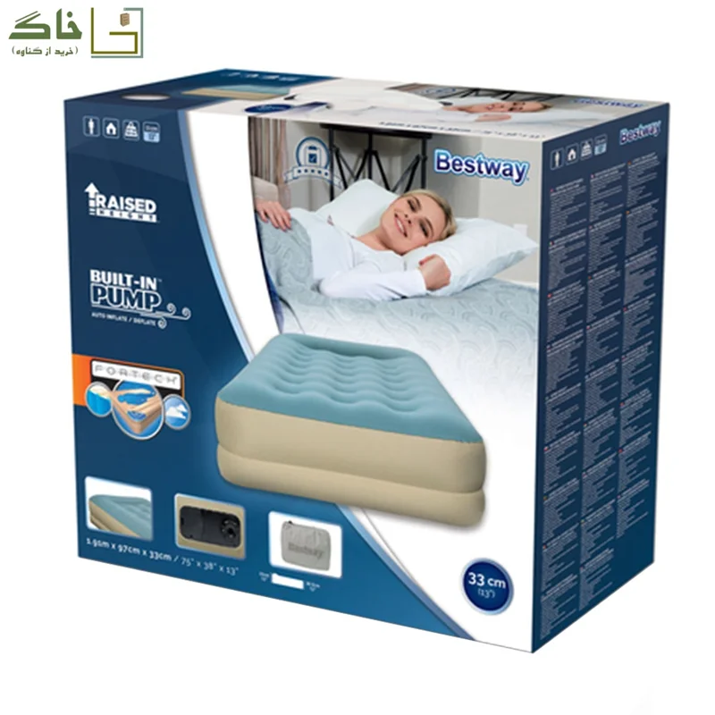 تخت بادی یک نفره بست وی مدل ریفایند فورتک کد 69005 محصولی بسیار حرفه ای و فوق العاده است که توسط برند معتبر «بست وی» (Bestway) عرضه شده است. تخت بادی «ریفایند فورتک» (Refined Fortech)، یک تخت خواب یک نفره عالی برای اتاق خواب بچه ها، نوجوانان و بزرگسالان محسوب می شود که با امکانات و فناوری هایی که در آن به کار رفته، آن را به یک تخت منحصر به فرد تبدیل کرده است. این تختخواب یک نفره بست وی میتواند هم برای مهمان در خانه و هم برای خوابیدن در حیاط یا فضای باز استفاده شود. عرض این تخت 97 سانتی متر و ارتفاع آن 33 سانتی متر است و برای یک نفر مناسب است. شرکت بست وی در تخت بادی ریفایند فورتک از فناوری های مختلفی بهره برده است که آن را از سایر محصولات مشابه متمایز نموده است. فیبر فورتک ترکیبی از پارچه پلی استر متراکم و PVC بادوام است که سطوح بالایی از استحکام، دوام و راحتی را فراهم می کند. پارتیشن های داخلی این تخت زیر وزن بدن تغییر شکل نمی دهند و همیشه ثابت می مانند. وزن فرد به طور مساوی در تمام سطح تخت بادی توزیع می شود و حتی ثبات بیشتری نسبت به تخت های بادی کلاسیک ایجاد می کند.
