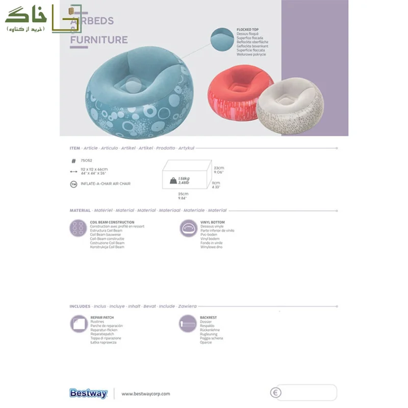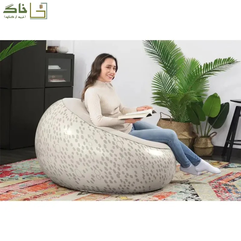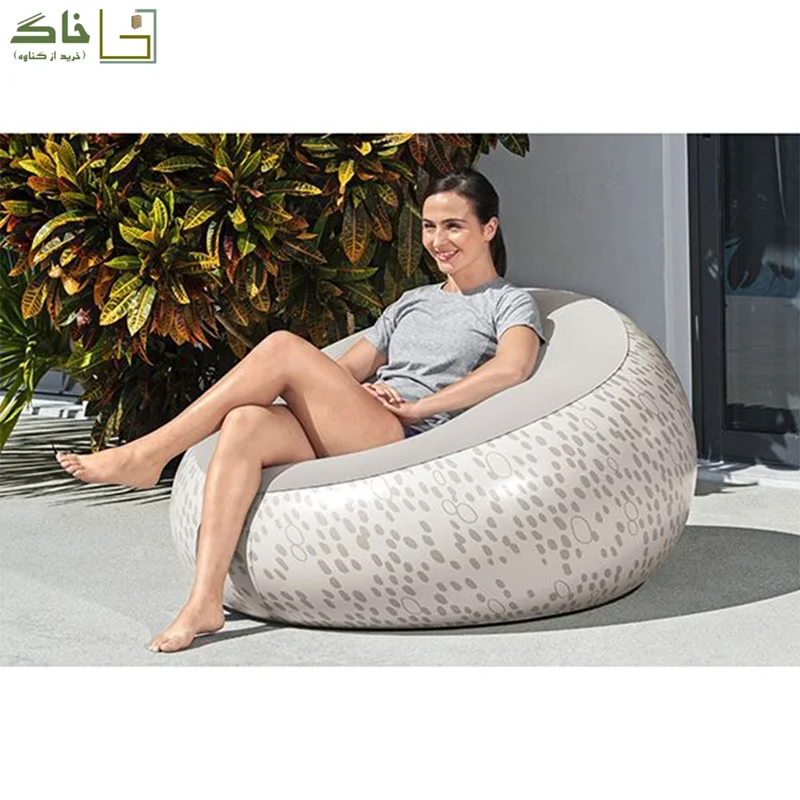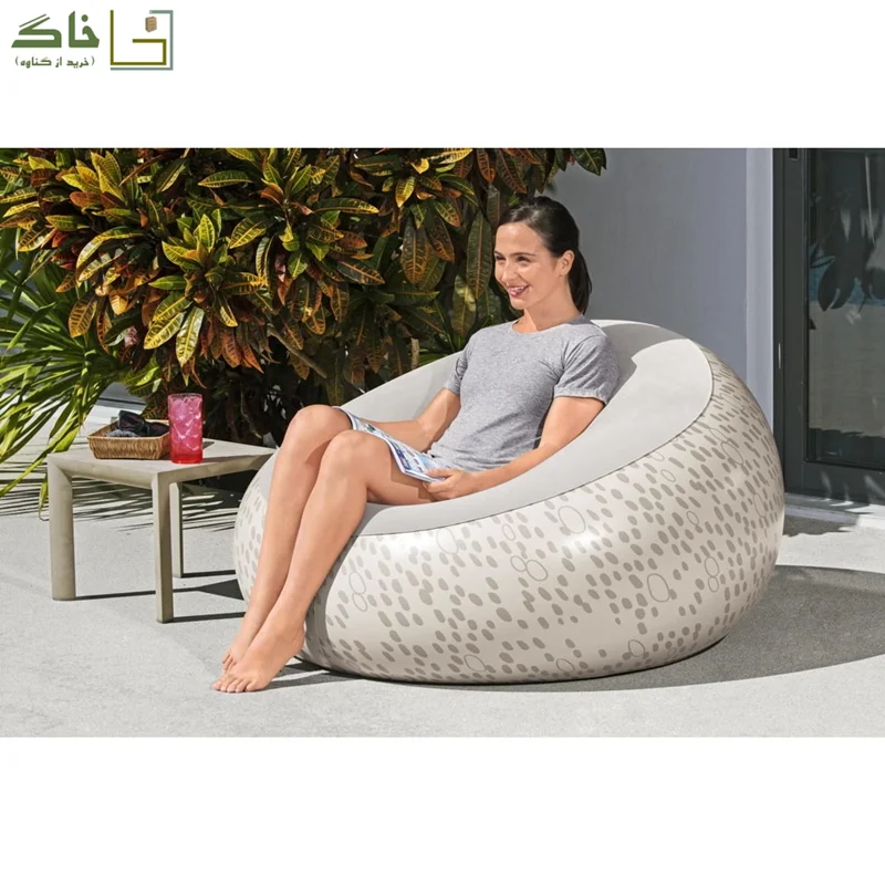 مبل بادی بست وی مدل اینفلیت اِ چیر کد 75052 رنگ کرم محصولی جذاب و کاربردی است که توسط برند معتبر «بست وی» (Bestway) عرضه شده است. مبل بادی «اینفلیت اِ چیر» (Inflate-A-Chair) یک مبل بادی بسیار راحت است که می توان در فضای داخلی و یا در فضای باز مانند حیاط خانه یا باغ و یا در کنار استخر از آن استفاده نمود. باد کردن این مبل بادی بست وی فقط چند دقیقه طول می کشد و در صورت نیاز می توان به راحتی آن را جمع کرد و در کمد گذاشت. در این مبل بادی از تکنولوژی «کویل بیم» (Coil Beam) استفاده شده است که مبل را هنگام استفاده محکم و سرپا نگه می دارد و ثبات و استحکام خود را با استفاده مکرر حفظ می کند. طراحی ظاهری راحت و مدرن این مبل بادی بسیار جذاب است و با سه طرح و رنگ مختلف عرضه شده است.
